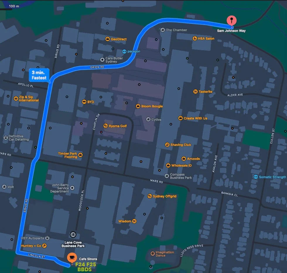 Take Sam Johnson Way off Epping Road and follow the map. Easiest access via back entrance at end of Lincoln Street. We are next door to Cafe Sinora.